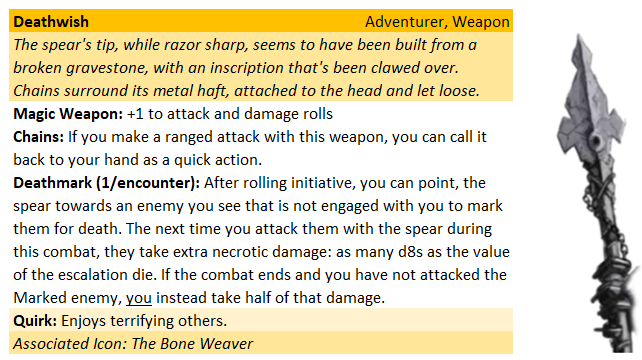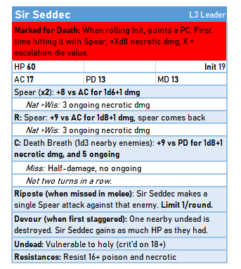 The Grave Knight (stat block below) started as a Medium Black Dragon. Like Yllara, I made it Lunk and switched its natural roll triggers to key off of PC’s ability scores. I reflavored its acid breath to necrotic damage, and changed its acid resistance to the standard Undead traits. I also changed its damage from static to a roll: while I like static damage, I prefer rolling it for named enemies. I changed the Draconic grace to the Riposte: I thought it would be somewhat similar, probably giving it an extra 2 or 3 attacks over the course of the battle. The ranged attack and Marked for Death abilities come from his magical spear. The Devour ability is just there for flavour: knowing he’d use it on a Skeleton, it would only be a +7 hit point boost, and would take one of its allies out.