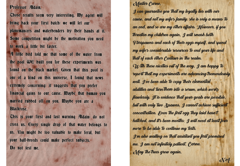 The first note is addressed to Nigel, and exposes a bit of the situation with him. It is also quite agressive, openly threatening his children. The other is Nigel’s response to “Master Carne”, responding to their threats with his own. Then follows a brief overview of the results of his research, and the limits he’s been facing.